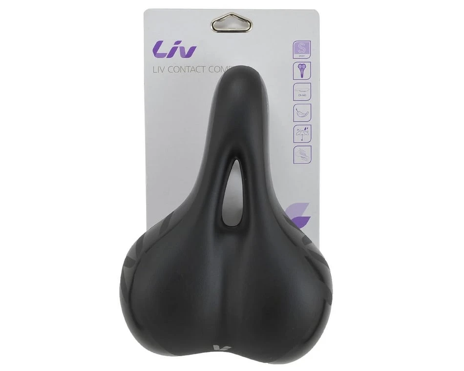 This is the Liv Contcat Comfort+ Women’s Bicycle Saddle. Comfort Plus says it all. This women’s specific saddle is made with comfortable padding, ergonomic shape, and a center cut relief zone to reduce pressure.