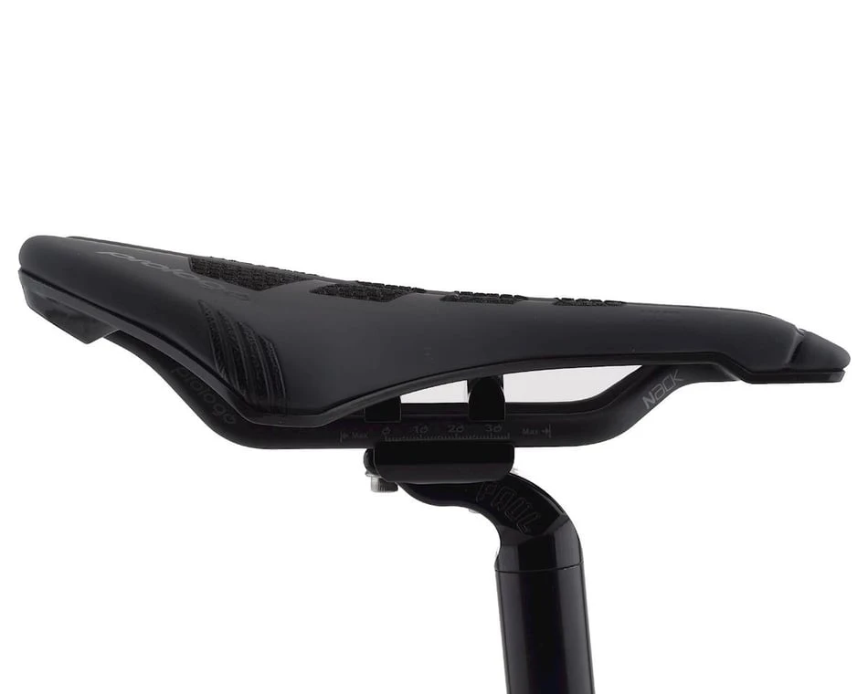 Saddle styles have dramatically changed. Prologo’s Dimension project is no exception to this snub-nose, wide-tailed saddle approach. It is all about comfort, performance, lightness and preventing perineal area problems. The project resulted in a saddle unlike anything Prologo had created. The saddle has a short nose (3+ cm shorter than a traditional saddle) to reduce contact and pressure in the frontal area, especially for low position riding, like riding in the drops. It also features a wide tail for improved stability, weight distribution and power transfer.