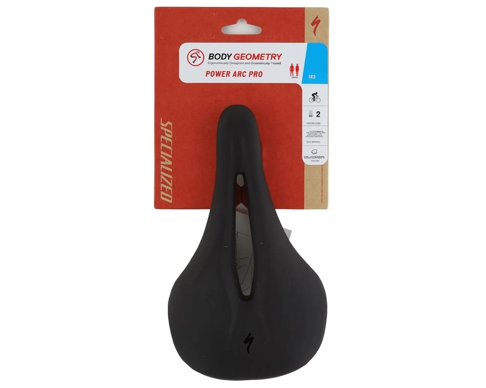 Expanding on the success of Specialized’s original Power saddle, the Power Arc Pro Elaston features the same channel and length as the original and S-Works Arc. Where it differs is in its titanium rails versus the carbon fiber found on the S-Works, but it still features a stiff FACT carbon fiber shell and lightweight EVA padding. The shape of the saddle is also designed to provide ample sit bone support, and this has been coupled with a shorter-than-usual nose section to keep pressure off of soft tissue while riding in aggressive positions. Proven through blood flow testing and pressure mapping, these improvements make a huge impact for comfort — regardless of how much time you want to put in on this saddle. The rails have the same channel, lengths, and hollow titanium rails as the original Pro Arc. Beyond that, there is a curved shape Body Geometry to make you feel as if you’re “in the saddle,” not on it. Ultimately this creates better performance in all seated positions, whether you’re a man or a woman.